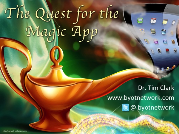 There are so many applications available for mobile devices and not enough time to use them all! Teachers are pursuing the magic app that will motivate their students, help them achieve, develop their digital age skills, and sustain their interest. In this session, determine new ways to hunt for apps; investigate their potential strengths and weaknesses; and capture some great apps from your colleagues. Come prepared with an app to share, and maybe you will even discover the magic app!