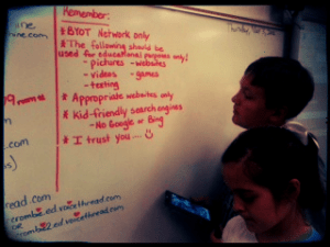 I brainstormed my own list and tried to organize it chronologically according to each of the five days. However, I again realized that in the BYOT classroom, many things have to happen just in time (or simultaneously), and a sequential list of orderly items was impossible (for me). As Anne Collier explained in her blog at NetFamilyNews.Org, all kinds of learning [happens] all at once with BYOT. Instead, I’ve enumerated a simple list of five strategies for the first five days of BYOT and provided links to additional resources whenever possible.